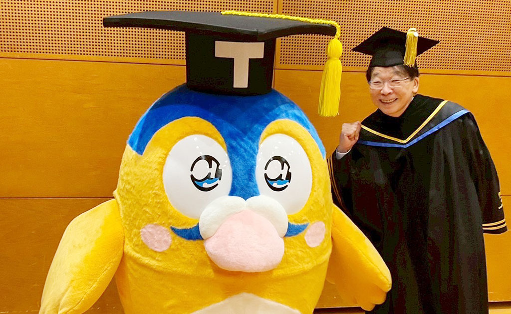 鳥取大学 理事(特命担当)として卒業式に列席しました。鳥取大学の新イメージキャラクター「トッティ」と。